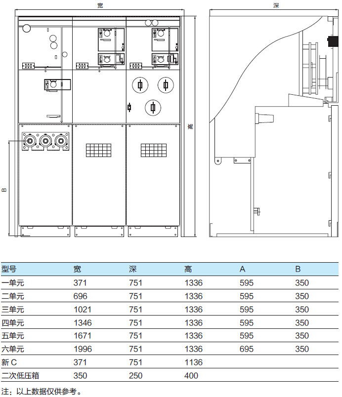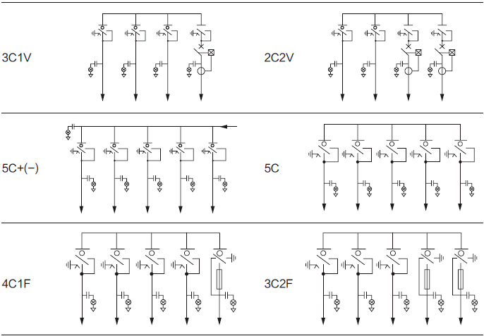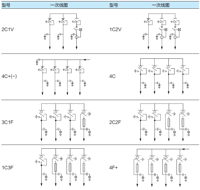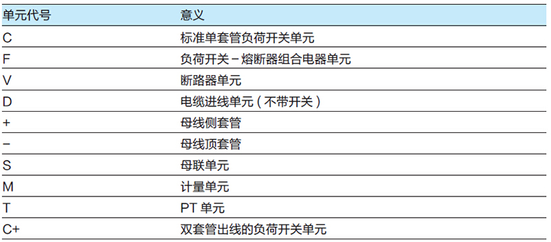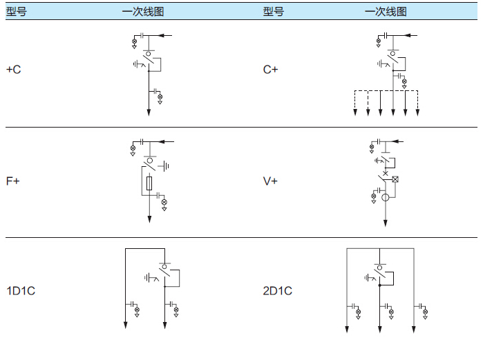 注:C: 负荷开关单元(单组套管出线) C+: 双套管出线的负荷开关单元