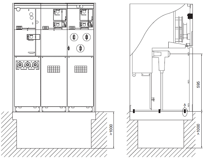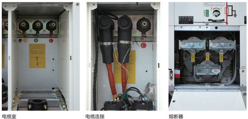 电缆连接室空间大,套管为标准式设计,实现与所有欧式标准电缆插头的配合。正常情况下每个负荷开关单元可接1~3回出线,特殊设计型可接4~6回出线。真空断路器单元可接1~2回出线。