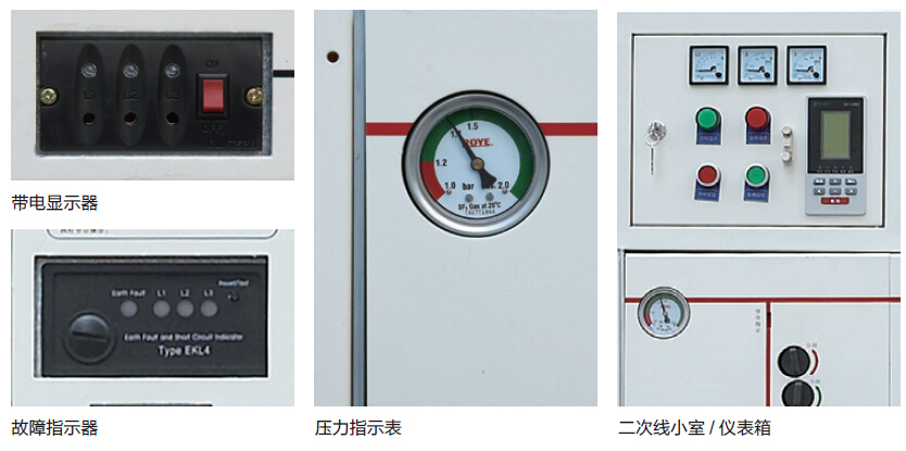 开关单元的进出线套管上配有容性电压指示装置。每个带电显示器本身还带有三相电压核相引出点,配置核相器可用于核相。
