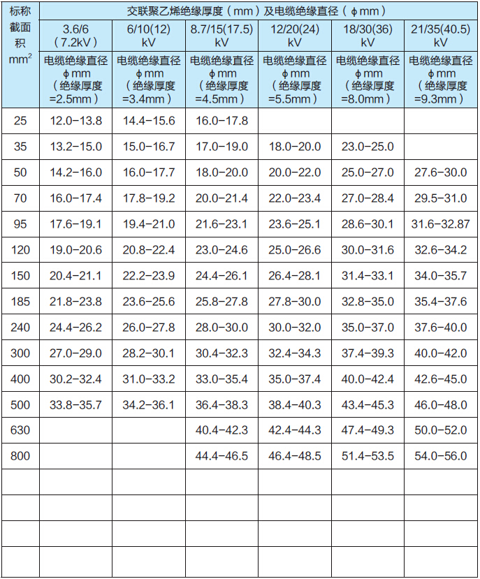 各种电压等级交联聚乙烯电缆主绝缘尺寸对照表